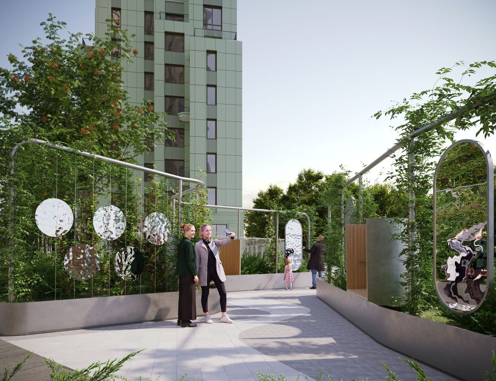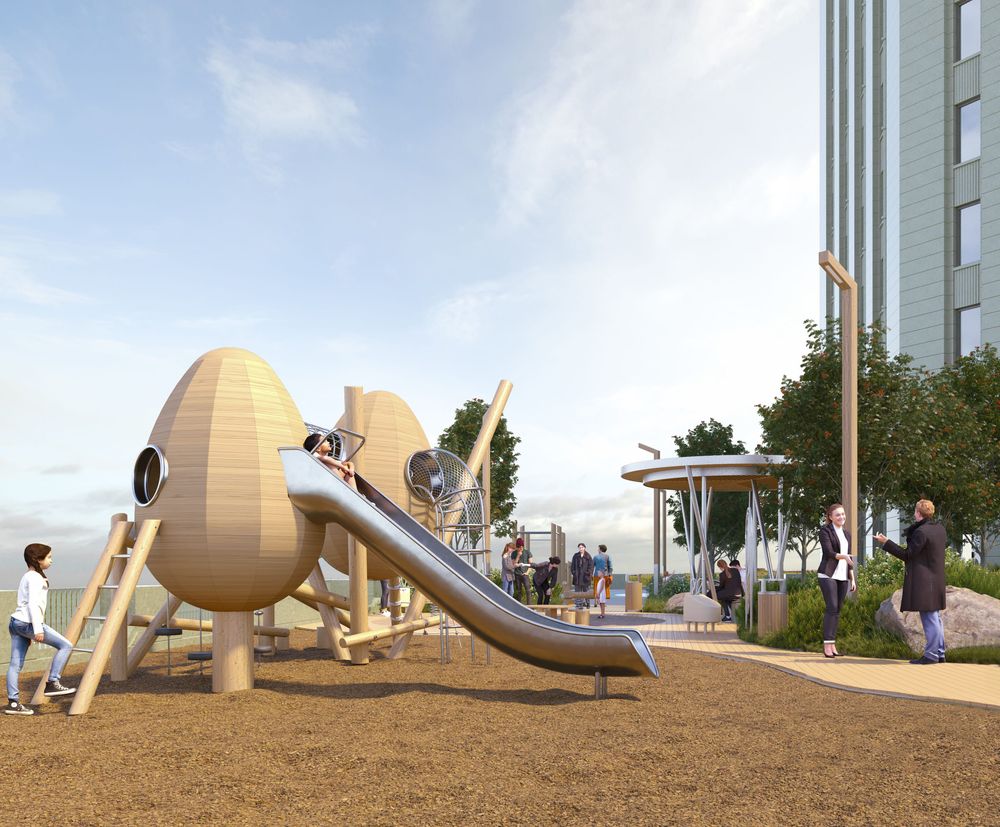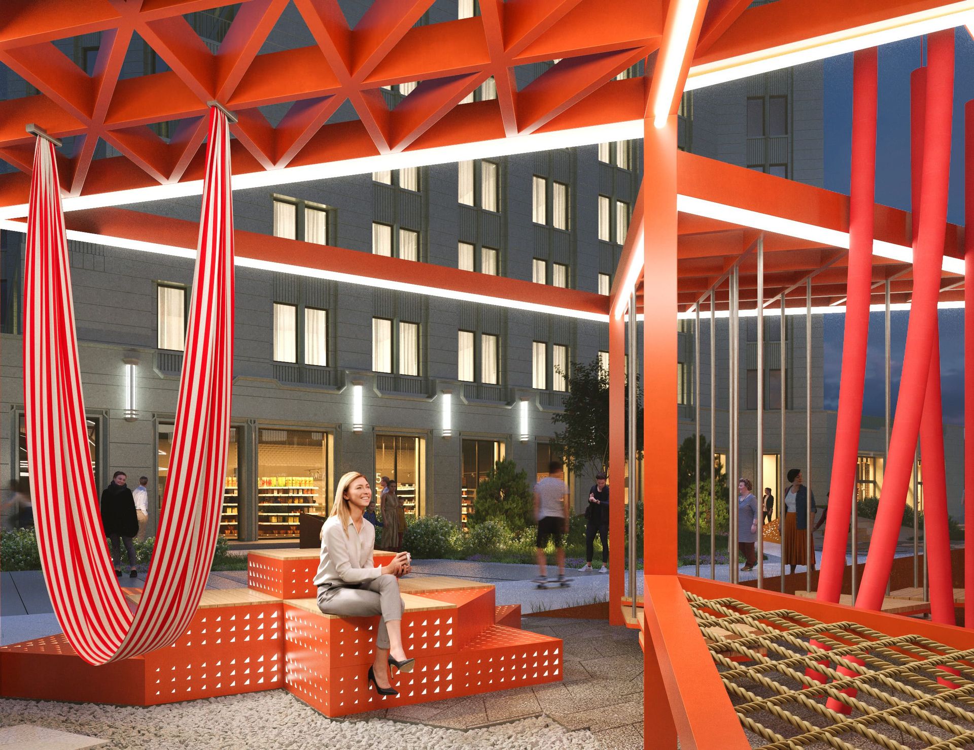 Среда в "Оригане" подчиняется общей концепции квартала и создается на трех уровнях: каньон, река и лес. При этом каждый элемент благоустройства поддерживается связь с природой и спроектирован с учетом взаимодействия с солнцем - символом стиля ар-деко, который воплощает в себе идею восхождения и возрождения